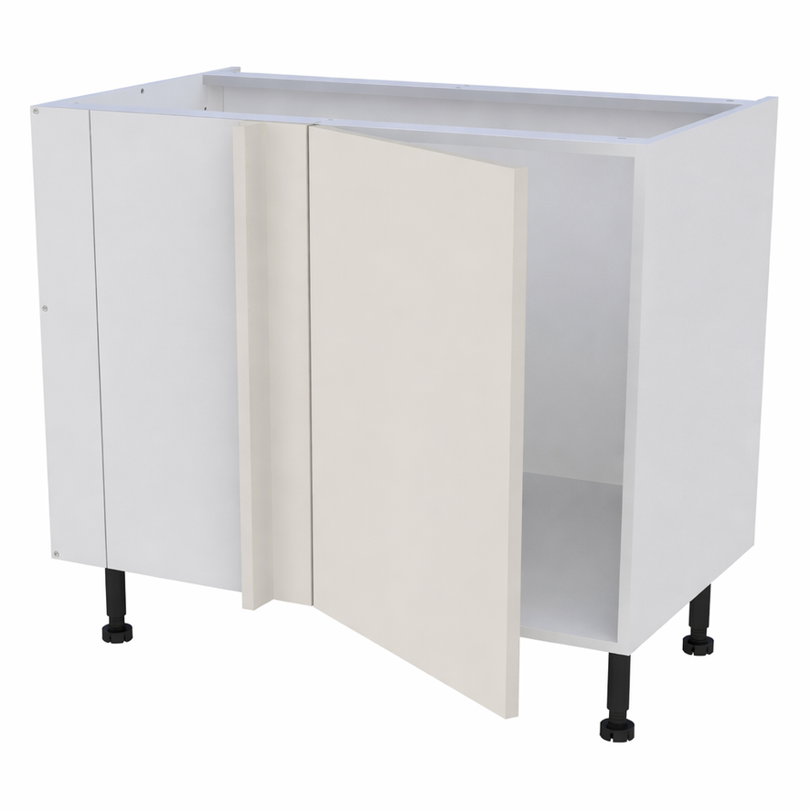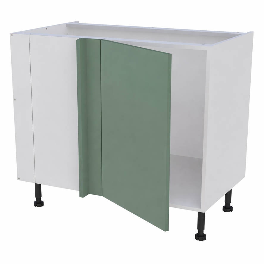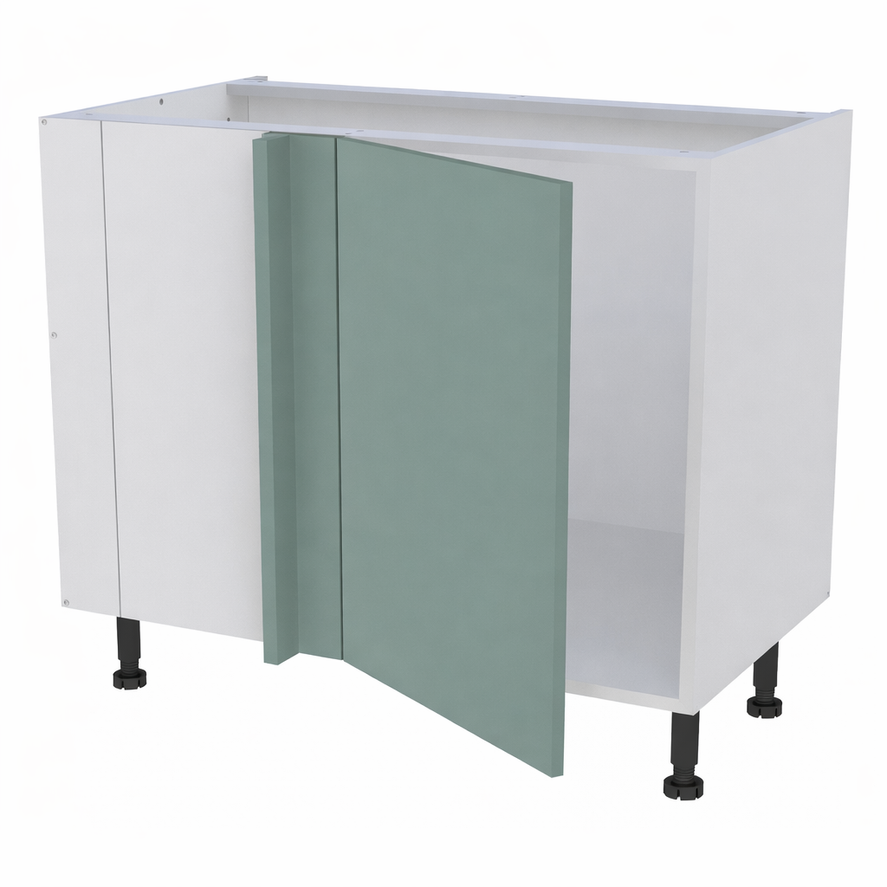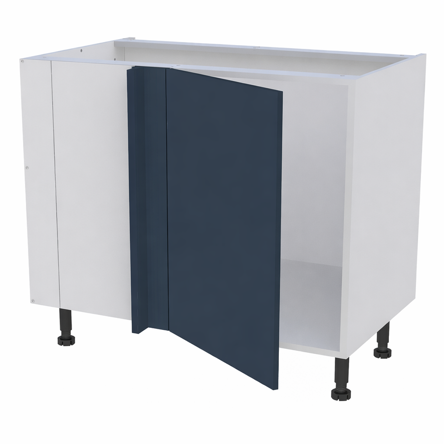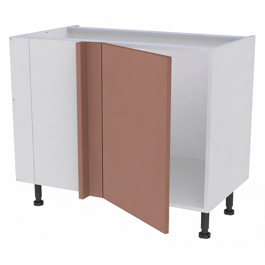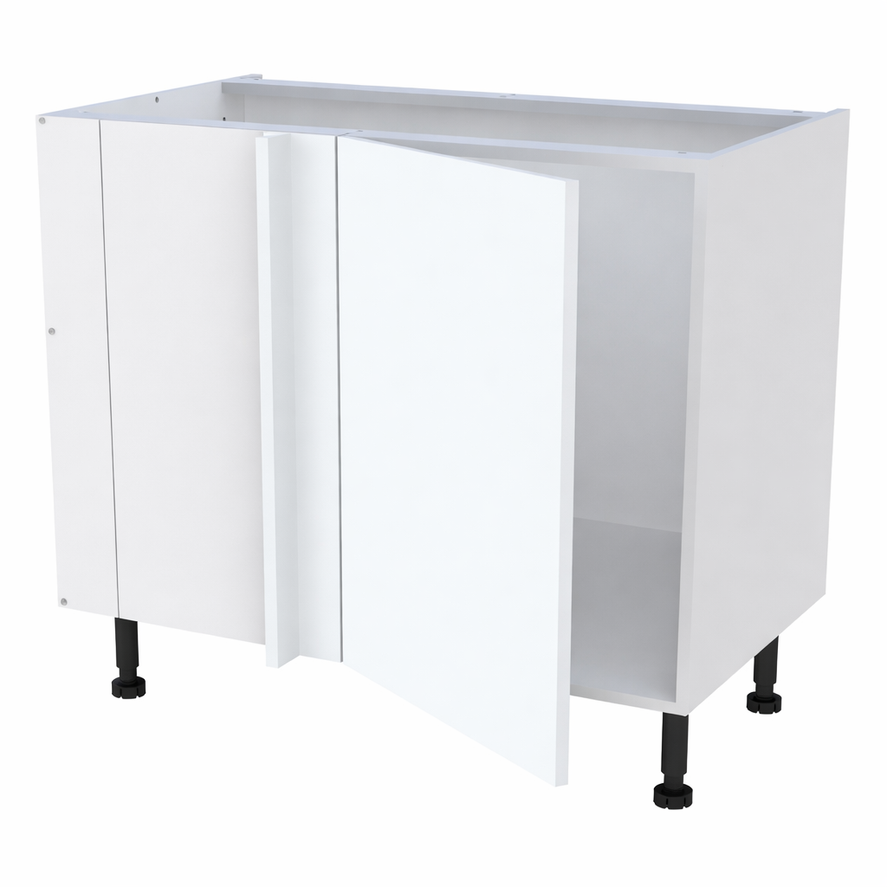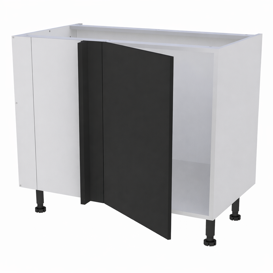 Caisson bas d'angle largeur 1150mm, 1 porte battante ferrage gauche + demi lune - Charnières amorties métalliques clipsables ouverture 110° .