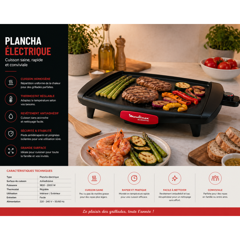 Profitez d’une cuisson simple et savoureuse avec cette plancha électrique au design compact. Idéale pour griller viandes, poissons et légumes, elle vous permet de cuisiner facilement au quotidien, en intérieur comme en extérieur.